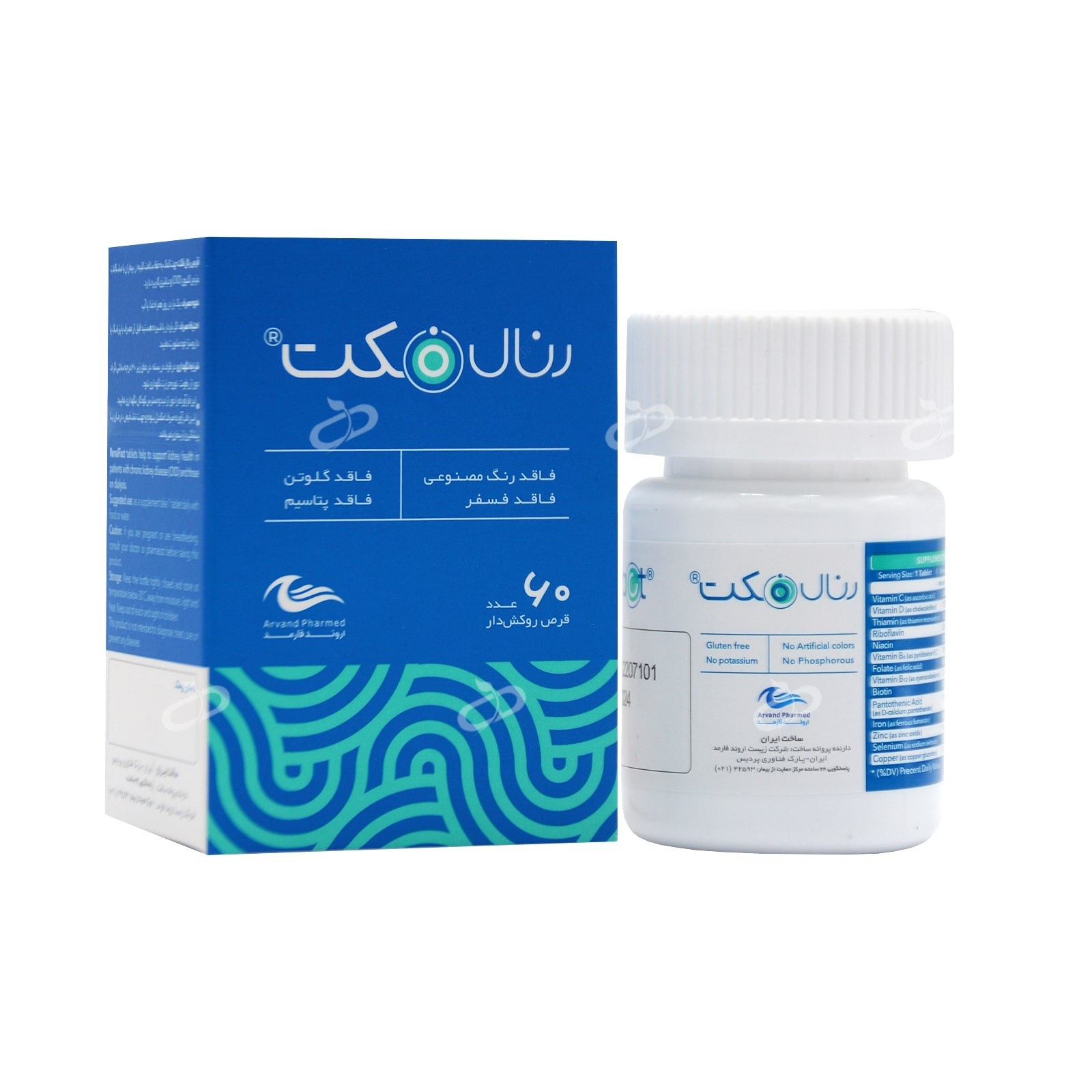 رنال فکت (سلامت کلیه) اروند فارمد 60 قرص Renal Fact Arvand Pharmed 60Tablets، دارای ویتامینC ،D3 ،B12 ،B5 و مواد معدنی زینک، آهن، نیاسین و سلنیوم است. رنال فکت با ترکیباتی که دارد به سلامت مبتلایان به مشکلات مزمن کلیوی از جمله افرادی تحت دیالیز، کمک می نماید. افراد تحت دیالیز، با توجه به کاهش عملکرد کلیه ها و محدودیتی که درمصرف مواد مغذی، دارند، نیازمند مصرف مکمل های غذایی مناسب و ضروری جهت تآمین مواد مغذی بدنشان می باشند. رنال فکت اروند فارمد مکملی مناسب جهت تآمین مواد مغذی افراد مبتلا به مشکلات کلیوی و دیالیزی می باشد و به بهبود و حفظ سلامت عمومی این افراد کمک می کند.